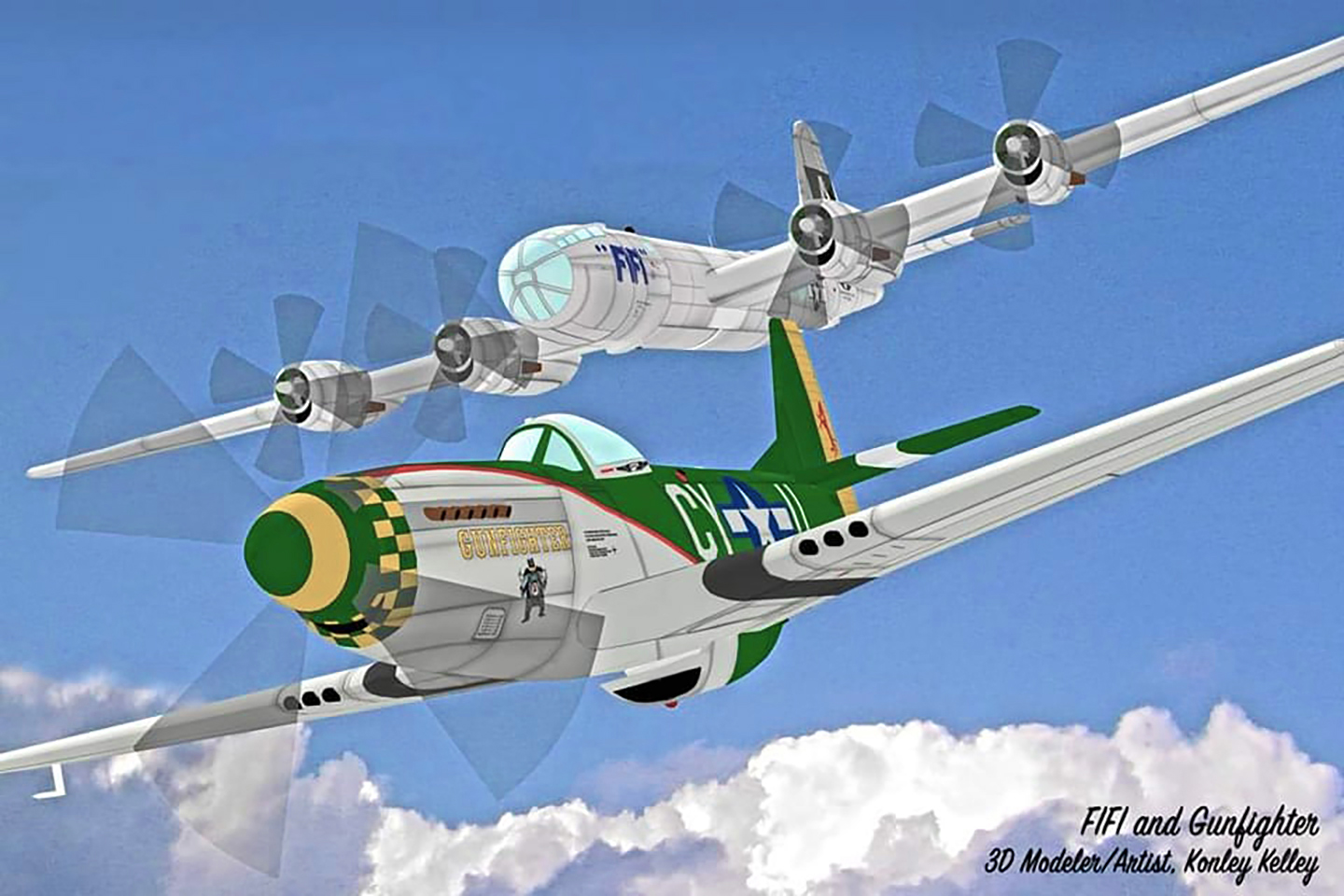 Combined 3D models in a scene featuring aircraft of my two friends, 1st. Lt. Charles Chauncey and Captain Jerry Yellin.
